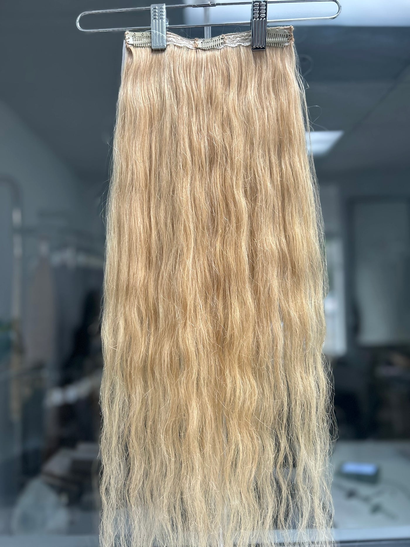 Method description: Our versatile hair solution features strains attached to a small metal clip that is clipped into the hair. A quick, easy, and temporary do-it-yourself approach to achieving longer and fuller hair with no long-term bonding, pain, or damage to your natural hair. It is a suitable method for those seeking to do beautiful hairstyles for parties, events, and so on. Clients can place them without pain, and they are easy to put on and take off whenever you want! Hairstylists can also remove the clips and install them as weft extensions. Experience the freedom to enhance your style whenever you desire! Heatless Application.