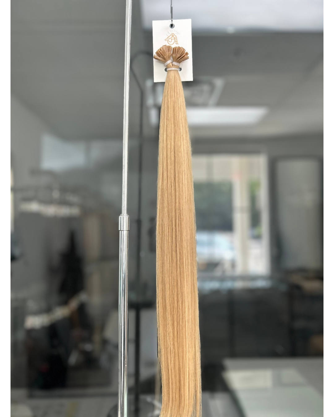 Method description: F-tip hair extensions are small bundles of hair - known as strands - with an Italian K keratin square flat shape. Each strand of hair is applied to your natural hair using a fusion hot or cold machine. Our tips already come with the right amount of glue so you can apply them directly without any hassle; the middle can be cut in if you want even a small tip.